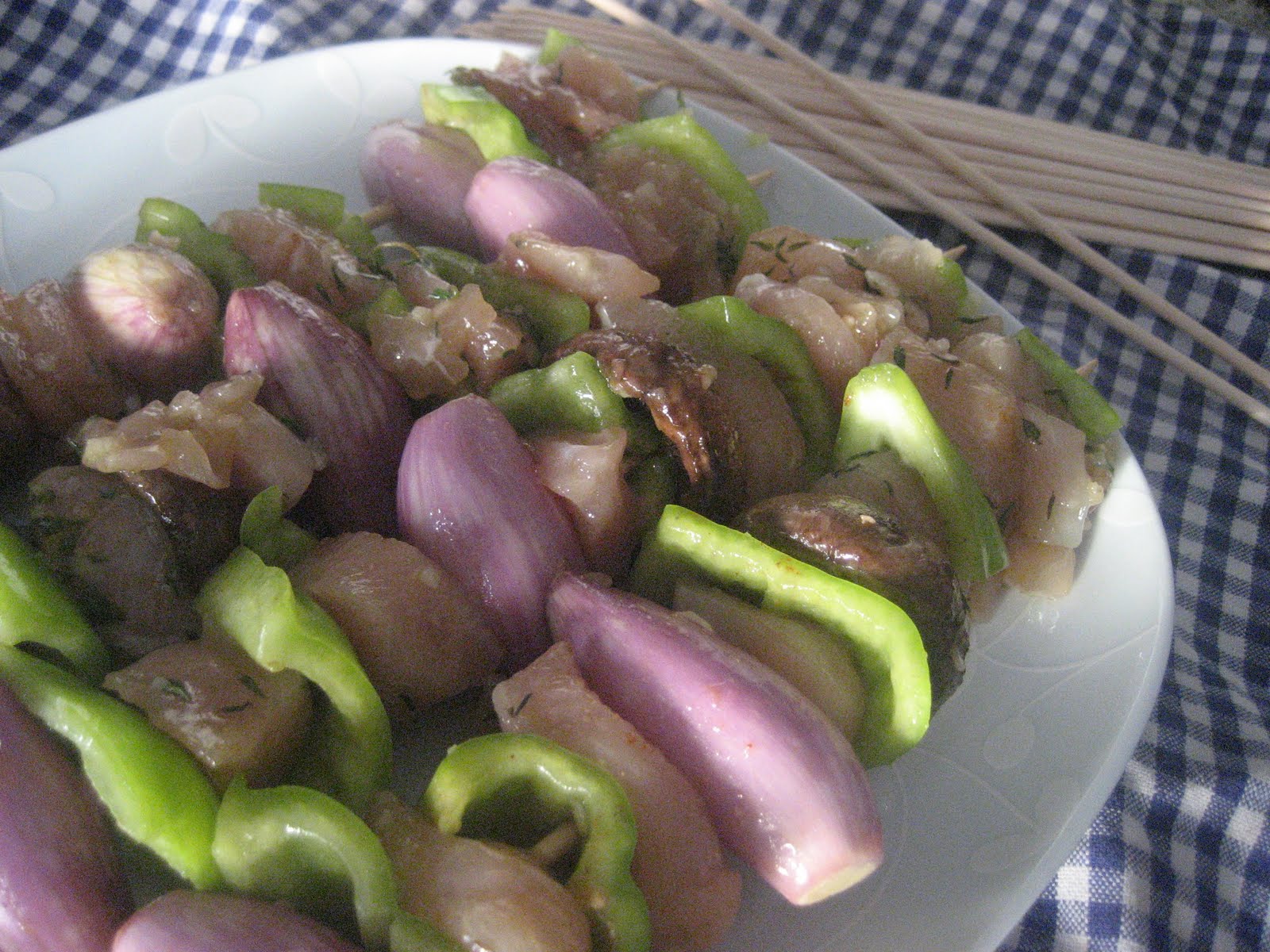 Mas a refeição não podia ser só as bruschettas. Então preparei umas espetadas com frango, pimento verde, chalotas e cogumelos, previamente marinadas em azeite, sal, folhas de tomilho e pimenta preta.